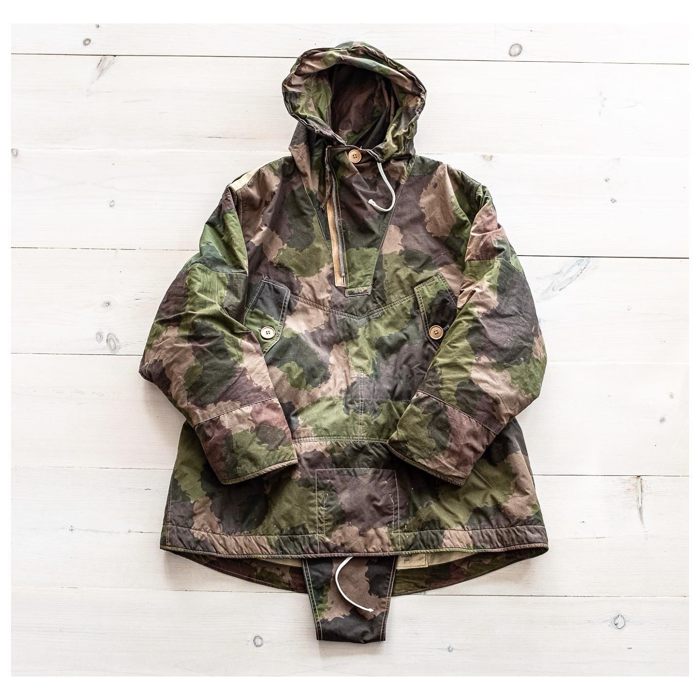 It uses the same camo as the SOE/OSS Striptease Suit used for Parachute insertion by allied agents etc. The overhead smock is made from ventile material lined with white wool and has a crotch flap for parachuting, double elbows and canvas strengthened shoulders, 1x large split front pocket with button closures, waist/hood drawstrings and a slight offset zipper.